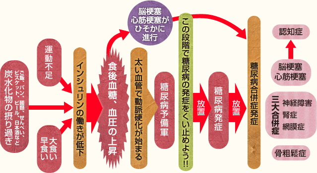 一言でいうなら「炭水化物の代謝障害」。炭水化物などのブドウ糖を取り込んでエネルギー源として利用するのですが、それがうまく取り込めなくなってしまう点が病気の本質です。糖尿病で最も恐ろしいのが、全身の血管が傷んで起こる、さまざまな合併症です。