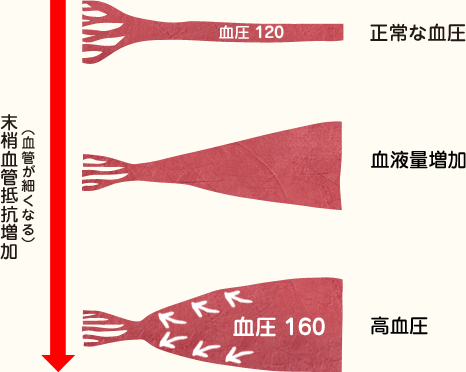 血液は太い血管から細い血管へと流れます。末梢の血管が太くなれば血液は流れやすくなり、細くなれば血液は流れにくくなるのです。血管の抵抗は、末梢の血管の太さで変化します。末梢の血管の抵抗が増し血液が流れにくくなると血管の中の圧力は大きくなります。また流れる血液量がふえても圧力は大きくなります。おもにこの二つの理由で血圧が上昇します。高血圧が怖いのは、動脈硬化を起こし心筋梗塞や脳卒中へとつながるからです。