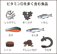 ビタミンDはカルシウムの吸収をよくするために、骨をつくるうえで欠かせない成分ですが、食事からだけではなく、日光浴により皮膚でもつくられます。夏なら木陰で30分、冬なら1時間程度、日に当たるだけでじゅうぶんです。一日中家の中にこもりきりの人は、食事からじゅうぶんなビタミンDを摂りましょう。