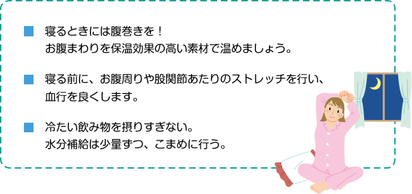 - 冷え性用の靴下や下着をつけて寝ることも効果的です。