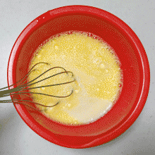 卵を溶き、生クリームを加え、炒め上がった<1>の具材とチーズ、高麗人参粉末を加え混ぜ合わせます。
